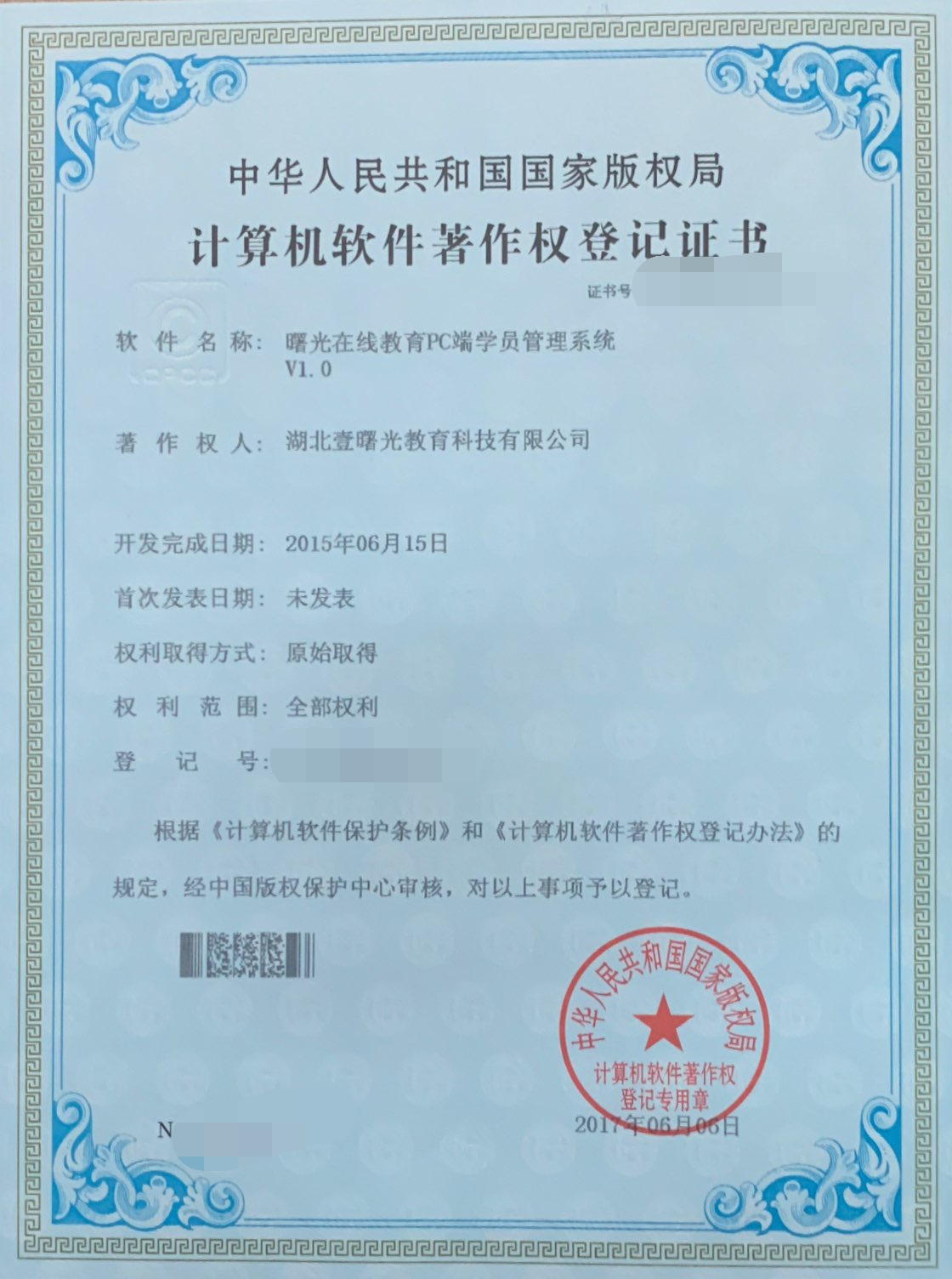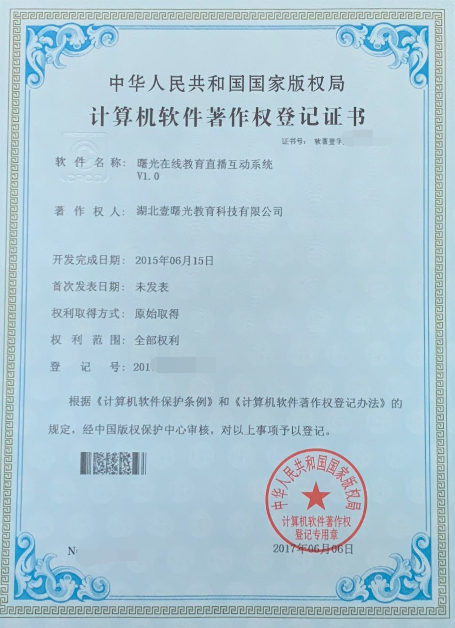 五個月以來,我公司詳細整理了所有已有軟件的相關資料,撰寫申請書等,于近日向湖北省版權局提交了八項軟件著作權的申請。截止目前,我公司共獲批兩項軟件著作權。本次獲批的兩項軟件著作權分別為曙光在線教育直播互動系統V1.0和曙光在線教育PC端學院管理系統V1.0。